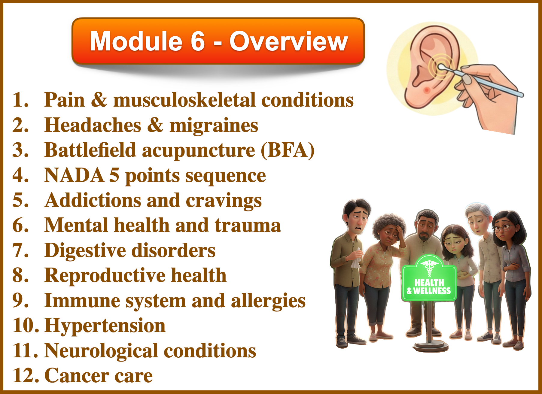 Module 6: Treatment Protocols for Common Conditions. Step-by-step protocols you can start using right away, including: stress and anxiety, pain (Battlefield Acupuncture), cravings, addictions, hormonal & digestive issues, Headaches, trauma, immune support, and more!