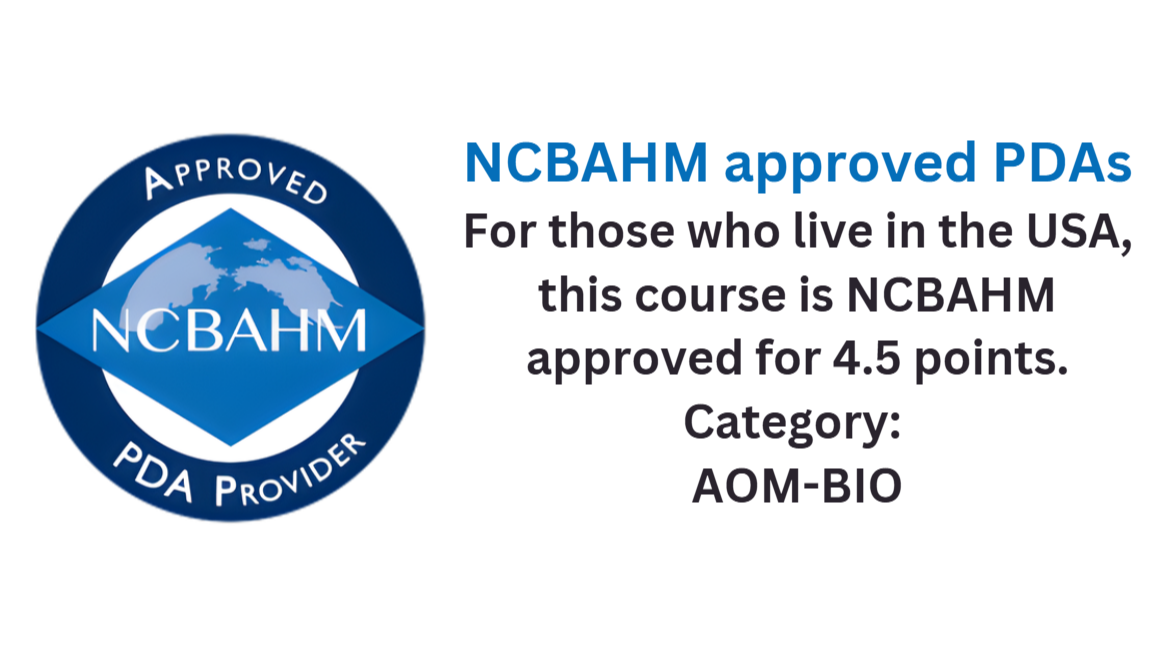 I understand that the information in this course presented by the Provider and/or Instructor(s) is for educational purposes only and should only be applied with appropriate clinical judgment and used by a trained and licensed practitioner. Governmental laws and regulations vary from region to region, and the contents of this course vary in permissible usage. The participant is required to check their local, state, and federal laws and regulations regarding the practice requirements and scope of practice issues and the use of the information in this course, including, but not limited to, theory, herbal medicine, and acupuncture. I acknowledge that NCBAHM does not endorse any specific treatment regimens of any kind. Furthermore, if I use any modalities or treatments taught in this course, I agree to waive, release, indemnify, discharge, and covenant not to sue NCBAHM from and against any liability, claims, demands, or causes of action whatsoever, arising out of any injury, loss, or damage that a person may sustain related to the use of the information in this course. I understand that this Release is governed by the laws of the District of Columbia, U.S.A. and shall survive the termination or expiration of this course.