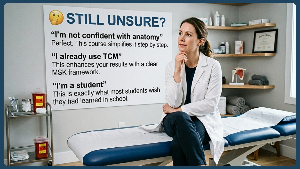 Both! The course is designed to meet you where you are. Whether you're in your final year of TCM school or have been in practice for years, you'll find material that elevates your clinical confidence and MSK skills.